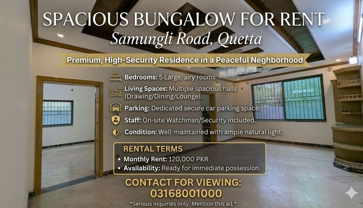 🏡 Spacious Bungalow for Rent – Samungli Road, Quetta